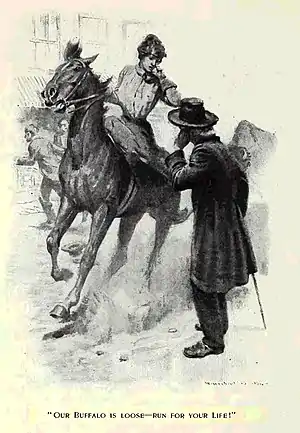 At this point, about twenty yards in front of her, she recognized old Mr. Jenks, whose twin social specialties were deafness and a maddening and inexorable tendency to discuss the weather. Mr. Jenks did not hear the hoofs of Sultan till they were fairly upon him. Molly made a megaphone of her hands and shouted: "Our buffalo is loose. Run for your life!"