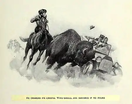 Molly and Buffy were soon neck to neck; she prodded Sultan with her heel, chirruping to him and begging him not to let himself be beaten by a door-mat, a sleighing-robe, one of a species all but extinct. Sultan responded gallantly, as one who had traditions to maintain. Then a motor-car went zigzagging by, carefully avoiding the informal Wild West Show, but weakly indulging itself in several purely ornamental honks, which proved the last straw for Buffy. Like most people reduced to sedentary lives, Buffy, when really put on his mettle, overdid. The honk of that automobile was as a deadly insult. He charged its crystal wind-shield, shivered it to atoms, and expressed himself forcibly. Then Buffy and the motor parted, with a feeling of mutual respect, but the car, sadder and wiser, honked no adieus, and the buffalo resumed the chase with something of the first flush of adventure gone.