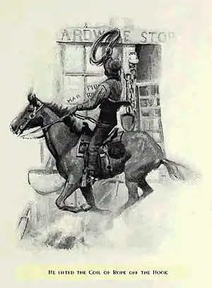 "Thanks for the tip," he said, with a quiet finality that made her take a second look at him. The next moment he was shouting to the Greek fruit-man to put up his shutters, and waving to two old ladies driving a pet horse of twenty-two down Main Street to cut and run down an alleyway. The elderly trio safe, Standish spurred across the street in the direction of the hardware-store. His eye swept the unfrivolous display of shovels, ashcans, preserving-kettles, and chains hanging like useful stalactites about its door. There was rope, too, but the sour grapes of fable hung no higher. No knight of old, jousting in a tournament, ever aimed with greater precision than Tom Standish riding at that coil of rope dangling from a second-story window of a hardware-store.
