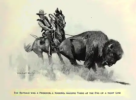 Molly out of danger, Standish urged his horse onto the sidewalk and gave the buffalo the right of way. The street was as clear as if newly swept by a cyclone. The inhabitants had sought second-story windows. In the mean time Standish had been doing things with that noosed coil of rope—getting it into positions that meant nothing in particular to these people of the effete East, but that would have signified much to any one in the habit of handling cattle or horses on the plains.