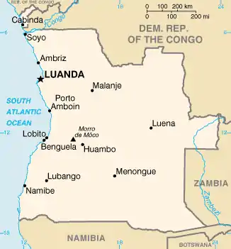 | Ports and harbors: | Ambriz, Cabinda, Lobito, Luanda, Malongo, Namibe (Mocamedes), Porto Amboim, Soyo |