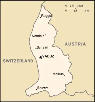 | Administrative divisions: | 11 communes (Gemeinden, singular - Gemeinde); Balzers, Eschen, Gamprin, Mauren, Planken, Ruggell, Schaan, Schellenberg, Triesen, Triesenberg, Vaduz |