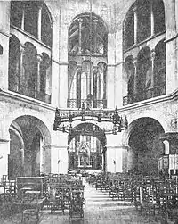 Ecclesiastically, Aachen constitutes a deanery of the archdiocese of Cologne. It has a collegiate chapter, already mentioned, with a provost, six regular and four honorary, canons; 12 Catholic parishes, 46 Catholic churches and chapels; in 1906, there were 87 secular, and 24 regular, clergy, besides 9 priests from other dioceses. The minster ranks first among the church buildings; it consists of three distinct parts: the octagon, the choir, and the crown, or ring, of chapels, the octagon forming the central portion. This last is the most important monument of Carlovingian architecture; it was built between 796 and 804, in the reign of Charlemagne, by Master Odo of Metz, and modeled after the Italian circular church of San Vitale at Ravenna. It was consecrated by Pope Leo III. It is an eight-angled, domed building, 54 feet in diameter, with a sixteen-sided circumference of 120 feet, and a height of 124 feet. The interior of the dome is adorned with mosaics on a gold ground, executed by Salviati of Venice, in 1882, representing Our Lord surrounded by the four and twenty Ancients of the Apocalypse. The main building was decorated with marble and mosaics in 1902 after the designs of H. Schaper. Over the spot supposed to be the site of Charlemagne's grave hangs an enormous corona of lamps, the gift of the Emperor Frederick I, Barbarossa; in the choir of the octagon, the so-called upper minster, stands Charlemagne's throne, made of great slabs of white marble, where, after the coronation, the German emperors received the homage of their nobles. The rich upper choir, built in Gothic style, joins on to the eastern side of the octagon; it was begun in the second half of the fourteenth century, and dedicated in 1414. The thirteen windows, each 100 feet high, have been filled with new colored glass; on the pillars
