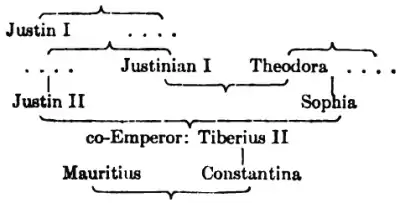 This period saw the reigns of two renowned and influential Byzantine empresses. As the world once held its breath at the quarrel between Eudoxia, the wanton wife of the Emperor Arcadius, and the great patriarch, John Chrysostom, and at the rivalry of the sisters-in-law, Pulcheria and Athenais-Eudocia, the latter the daughter of an Athenian philosopher, so Theodora, the dancer of the Byzantine circus, and her niece Sophia succeeded in obtaining extraordinary influence by reason of their genius, wit, and political cleverness. Theodora died of cancer (548), seventeen years before her husband. No serious discord ever marred this singular union, from which, however, there was no issue. The death of this remarkable woman proved an irreparable loss to her consort, who grieved profoundly for her during the remainder of his life. Her niece, Sophia, who approached her in ambition and political cunning, though not in intellect, had a less fortunate ending. Her life was darkened by a bitter disappointment. With the help of Tiberius commander of the palace guard, a Thracian famed for his personal attractions, she placed on the throne her husband, Justin II (565-78), who suffered from temporary attacks of insanity. Soon Sophia and Tiberius became the real rulers of the empire. In 574 the empress succeeded in inducing her husband to adopt Tiberius as Caesar and coregent. The death of Justin (578), however, did not bring about the hoped-for consummation of her relations with Tiberius. Tiberius II (578-82) had a wife in his native village, and now for the first time presented her in the capital. After his accession to the throne, he revered the Empress Sophia as a mother, and even when the disappointed woman began to place obstacles in his path, he was forbearing, and treated her with respect while keeping her a prisoner.