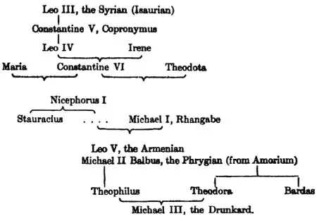 During this period two dynasties occupied the throne, each lasting for several generations. Both were of Eastern origin, the one from Northern Syria, the other from Phrygia. Leo V (813-20) also was of Oriental extraction. On the other hand, Nicephorus I (802-11) and his son-in-law Michael I, Rhangabe (811-13), were Greeks. In other words, the government of the empire became orientalized. This racial antagonism must be borne in mind in order to grasp the bitterness of the religious contentions of the period. The same period shows a second dynastic anomaly: for the first and last time there is an empress on the throne not as regent, but with the full title Basileus. This is Irene, perhaps the most disagreeable character of all the great Byzantine women. Like Athenais, she was an Athenian, but in the charm of the Muses she was totally lacking. Two passions possessed her soul: ambition and religious fanaticism, but her piety was of a strange kind. She persisted in her devotion to her party with the unswerving conviction that her opinion was right, and she did not hesitate to commit the most atrocious crimes of which a woman could be guilty in order to ruin her son morally and physically. Not without reason has Irene been compared to Catherine de' Medici. On the death of her husband, Leo IV (775-80), in her desire for power she strove to keep her son as a minor as long as possible, and finally to set him aside altogether. Of her own authority she canceled the betrothal of Constantine VI (780-97) to Rotrud, the daughter of Charlemagne, and forced him to marry Maria, an Armenian, a woman wholly distasteful to him. When the seventeen-year-old emperor showed a disposition to escape her power, she had him scourged with rods. She finally lent her sanction to his marriage with a woman of the court, Theodota, a union regarded by the Church as bigamous. In this way she thought to make his accession to power impossible. The worst, however, was still to come. Irene took advantage of an uprising to rid herself of her son permanently. Constantine VI, blinded at the command of his mother, ended his life in an obscure apartment of the imperial palace, where Theodota bore him a son. His mother now ruled alone (797-802) until the elevation of the grand treasurer, Nicephorus put an end to her power, and she spent her remaining years on the island of Lesbos in sickness and poverty.