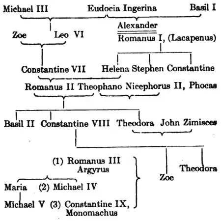 The period of the highest development of Byzantine power was not dynastically the most fortunate. Seldom has there been such an accumulation of moral filth as in the family of Basil the Macedonian (867-86). The founder of the house, a handsome hostler of Armenian extraction, from the vicinity of Adrianople, attracted the notice of a high official by his powerful build and his athletic strength and later gained the favour of the dissolute emperor Michael III, the last of the Phrygian emperors. Basil was also a favourite with women. His relations with the elderly Danielis of Patras, whom he had met whilst in the retinue of his master, were most scandalous. The gifts of this extremely wealthy woman laid the foundations of Basil's fortune. The depth of his baseness, however, is best seen in his marriage to the emperor's mistress, Eutocia Ingerina. Michael III stipulated that Eutocia should remain his mistress, so that it is impossible to say who was the father of Leo VI, the Wise (886-912). His physical frailty and taste for learned pursuits during his reign the Code of the Basilica was prepared in sixty books - as also the mutual aversion between Basil and Leo are no evidence for the paternity of the Macedonian. If this view be correct Basil's line was soon extinct; as his real son, Alexander, reigned only one year (912-13). Constantine VII, Porphyrogenitus (913-59), the long wished-for heir, by the fourth marriage of Leo the Wise, inherited the learned tastes of his father, but was not completely deficient in energy. It is true he left the government at first to his father-in-law, Romanus I, Lacapenus (919-44), and later to his wife Helena, still, when Romanus had become too overbearing, Constantine VII showed himself possessed of enough initiative to enlist the aid of Stephen and Constantine, sons of Romanus, in overthrowing the power of their father, and, later, to set aside his brothers-in-law (945). In Romanus II (959-63) the dissolute nature of his great-grandfather Michael III reappeared. His reign, fortunately, lasted only a few years, and then Theophano, his widow, the daughter of an innkeeper, took into her hands the reins of government, for her minor sons. Circumstances compelled her marriage with Knifers II, Phocas (963-69), an old and fanatically religious warrior. He is the first of that series of great military leaders who occupied the Byzantine throne, and who soon raised the empire to undreamed of heights of power. As in the dynasty of Heraclius three of these reigned in succession Nicephorus II, John Zimisces, and Basil II. John I, Zimisces (969-76), was the nephew of Nicephorus, but very unlike him. The younger man was as joyous and life-loving in disposition as the older was grim and unlovable. Theophano, therefore, did not hesitate to introduce into the palace the murderer of her morose husband. But like Sophia, niece of the great Theodora, she saw her hopes dashed to the ground. The new emperor confined her in a convent and, to legitimize his power married Theodora, sister of Basil and Constantine, the two young emperors. Like his uncle, John Zimisces was only coregent but he showed great force in his administration of affairs. At his death the elder of the young emperors was competent to take charge of the State. Luckily, Basil II (976-1025) proved as capable a military leader as his two predecessors. It was under his brother, Constantine VIII (1026-28), that the reaction set in. In opposition to the great imperial generals who had brought the empire to an unhoped for pinnacle of power, a civilian party had grown up which had for its aim the curtailment of military power. This party was successful during the reigns of Constantine and his successors Constantine VIII left two daughters, Zoe and Theodora. Zoe (1028-50) was forty-eight years of age at the death of her father, but even after that married three times, and by her amours and her jealousy brought many trials upon her younger sister. Zoe's three husbands Romanus III, Argyrus (1028-34), Michael IV (1034-41), and Constantine IX, Monomachus (1042-54) all came from the higher bureaucratic circles Thus the civil party had gained its end. This explains why neither Zoe nor the nephew of her second husband, whom she had adopted, and who proved so ungrateful, Michael V (1041-42 - termed the Caulker because his father was a naval engineer) could uphold the glory attained by the State during the times of the great military emperors. Even generals as great as Georgius Maniaces and Harold Hardrada - the latter, chief of the North-German (Varangian) bodyguard which was coming more and more into prominence - were powerless to stem the tide of the decline. The general discontent was most manifest when Theodora, on the death of her sister and her last surviving brother-in-law, assumed the reins of power, and not unsuccessfully (1054-56). On her deathbed she transferred the purple to the aged senator Michael VI, Stratioticus (1056-57. This was the signal for the military power to protest. The holders of great landed estates in Asia Minor gave the power instead to one of their own faction. Isaac I, Comnenus, inaugurates a new era.