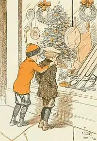 "Here we are," he cried a few minutes later and both boys stopped in front of a small shop window that looked very gay with a wonderful display of Christmas toys.