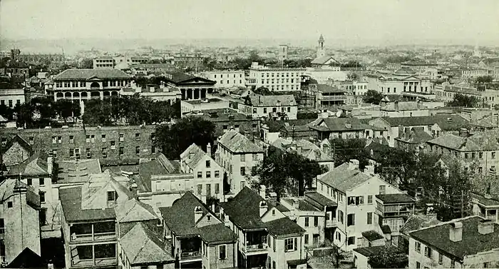 Topography.—The city is built on a peninsula at an average elevation of 8 to 10 feet above high water. The streets are generally at right angles, and four, King and Meeting streets, and Rutledge and Ashley avenues, run N. and S. the entire length of the city. The former is the principal retail street. At its S. extremity is a beautiful park, named White Point Garden, and to the E. of this is the Battery, a broad esplanade, 1,500 feet long, and affording a grand view of the harbor and forts. The public buildings are grouped about the intersection of Meeting and Broad streets, and consist of the court house, a substantial brick building; the City Hall, an imposing structure, entered by a double flight of steps, and the new Postoffice, a magnificent four-story building of Carolina granite, with a tower and all modern appliances, costing about $500,000. The United States Custom house, near Market wharf on the Cooper river, is a magnificent building, having cost $3,000,000. In front of the City Hall is Washington Park, containing two handsome fountains and a statue of William Pitt, erected before the Revolution. One of the arms was shot off by the English in 1780. There is also a monument to the Confederate dead.