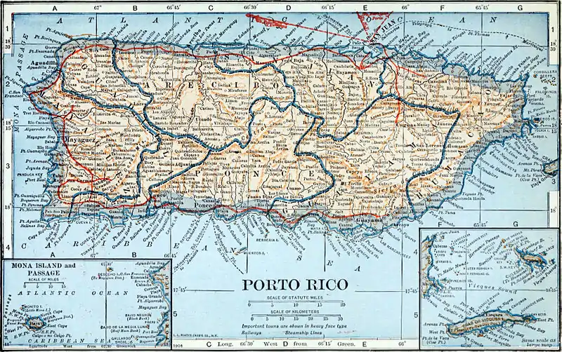 PORTO RICO, the most easterly of the Greater Antilles Islands of the West Indies, a territorial possession of the United States. It has an area of 3,606 square miles. The island is roughly rectangular in shape. It is about 100 miles in length. The coast line is about 360 miles long, with comparatively few important indentations. A broken irregular range of hills passes across the island from east to west, ranging in height from 2,000 to 3,000 feet.