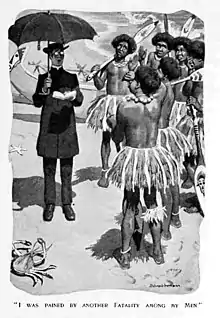 "They were cannibals, and they did try to eat me," replied the Bishop. "Indeed, I may explain that my ministrations among them ceased abruptly—a man-of-war providentially touching at our island at the very moment when the situation had become crisic—because of their regrettable disposition to assimilate my person rather than my teachings. Their determination to make use of me as an edible, it is but fair to add, was purely instinctive and quite untouched by malevolence. Until that instinct asserted itself—a full year after my ministrations among them began—our relations were most cordial; and I am quite sure, so genuine was their kindly feeling for me, that even had I been absorbed into their midst as a nutritive their affection for me would have continued unchanged.