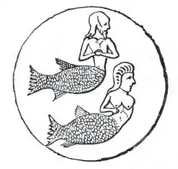 In precisely similar manner the Semitic moon-goddess, who followed the course of the sun, at times manifesting herself to the eyes of men, at others seeking concealment in the western flood was represented as half woman, half fish, with characteristics which make her lunar origin indisputable. Her name was Derceto or Atergatis. On the coins of Ascalon, where she was held in great honour, is figured a goddess above whose head is a half-moon, and at her feet a woman with her lower extremities like a fish. This is Semiramis, who, according to a popular legend, was the child of Derceto. At Joppa she appears as a mermaid. The story was, that she fled from Typhon, and plunged into the sea, concealing herself under the form of a fish. According to Plutarch, the Syrian Tirgata, the Derceto of Palestine, was the goddess of moisture[6]; and Lucan (De dea Syra, c. 14) declares that she was represented as a woman with a fish-tail from her hips downward.