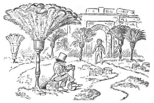 Davy looked around and saw an old man coming toward them across the lawn. He was dressed in a Turkish costume, and wore a large turban and red morocco slippers turned up at the toes like skates; and his white beard was so long that at every fourth step he trod upon it and fell flat on his face. He took no notice whatever of either Davy or the Goblin, and, after falling down a number of times, took his seat upon one of the little carpet footstools, and taking off his turban began stirring about in it with a large wooden spoon. As he took off his turban Davy saw that his head, which was perfectly bald, was neatly laid out in black and white squares like a chess-board.