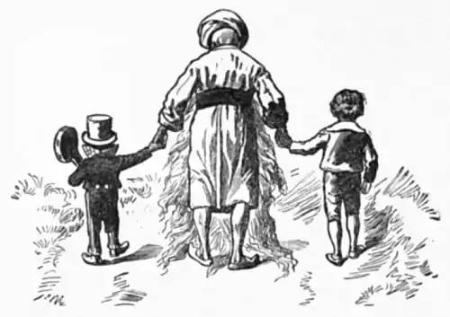 “Oh, that name,” said Sindbad,—“that was given to her by the Alamagoozelum of Popjaw. But speaking of soup-tureens, let’s go and have some pie;” and, rising to his feet, he gave one hand to Davy and the other to the Goblin, and they all walked off in a row toward the little shell house. This, however, proved to be a very troublesome arrangement, for Sindbad was constantly stepping on his long beard and falling down; and as he kept a firm hold of his companions’ hands they all went down in a heap together a great many times. At last Sindbad’s turban fell off, and as he sat up on the grass, and began stirring in it again with his wooden spoon, Davy saw that it was full of broken chessmen.