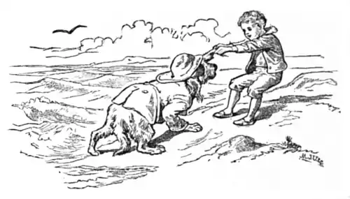 The wind was blowing fiercely, and a cloud of spray was dashed in his face as he turned toward it, and presently the air was filled with lobsters, eels, and wriggling fishes that were being carried inshore by the gale. Suddenly, to Davy’s astonishment, a dog came sailing along. He was being helplessly blown about among the lobsters, uneasily jerking his tail from side to side to keep it out of reach of their great claws, and giving short, nervous barks from time to time, as though he were firing signal-guns of distress. In fact, he seemed to be having such a hard time of it that Davy caught him by the ear as he was going by, and landed him in safety on the beach. He proved to be a very shaggy, battered-looking animal, in an old pea-jacket, with a weather-beaten tarpaulin hat jammed on the side of his head, and a patch over one eye; altogether he was the most extraordinary-looking animal that could be imagined, and Davy stood staring at him, and wondering what sort of a dog he was.