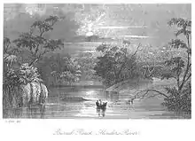 Hurrying on with a still favourable tide, but at a rate much too slow for our impatience, we passed two other small grassy islets, and a third was before us. The eastern bank had become steep, overhanging, and clothed with a mass of luxuriant creepers; whilst on the opposite side was a low woody patch, partly immersed by the lake-like glassy water of the river, into which one slender tree dipped its feathery crest, appearing like another Narcissus, to admire its own beauty in the stream. In front, the eye could penetrate far down the reach hemmed in as it was by trees that clustered thick on the water's brink.