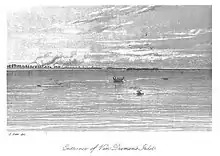A fruitless attempt was made to visit the shore, which was fronted for the distance of a mile by a bank of soft mud. We could therefore gain no information respecting the interior; but from the numerous fires, it appeared to be thickly inhabited. It was here that we first observed the singular phenomenon of the tides ebbing and flowing twelve hours.
