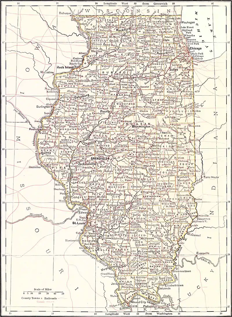 Plate V. ILLINOIS, the twenty-first in the order of admission and the fourth in rank of population of the States of the American Union, is one of the group of States formed out of the “North-West Territory.” Its boundaries, beginning at the point where the Wabash river joins the Ohio, pass thence north by that river, by the west line of Indiana, and by Lake Michigan to 42° 30' N. lat., thence west to the Mississippi river, thence south by that river to its confluence with the Ohio river, and thence, by that, north-easterly to the mouth of the Wabash. It has an area of 55,414 square miles, extending with varying width from 42° 30' to 36° 59' N. lat.