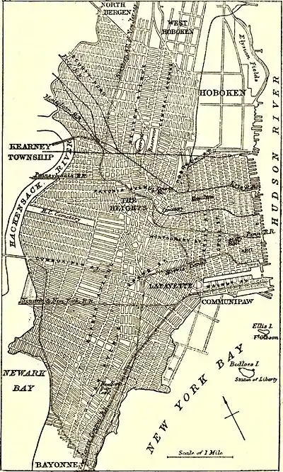 JERSEY CITY, the chief city of Hudson county in the State of New Jersey, U.S., is situated on the west bank of the Hudson, opposite New York, to which it stands in a relation similar to that cf Birkenhead to Liverpool. It is laid out irregularly, owing to its being an aggregation of three formerly distinct municipalities. Many of the streets are broad and well paved, and the city is provided with efficient gas, water, and sewerage systems. It has few striking buildings, the most prominent structures being the immense grain elevators near the river, three hospitals, an orphan's home, and the public school buildings, 21 in number. The public schools are supported by State and city taxes, and administered by a board of education. The trade of the city is very considerable; but, as it is embraced in the New York customs district, separate returns are not made. The fact that it is a terminus for three lines of ocean steamers, five trunk-lines of railways, seven lesser railways, and the Morris canal, greatly facilitates the transport of coal, iron, &c., and materially fosters its industries. Jersey City has iron-foundries, iron, steel, and zinc works, boiler yards, machine shops, railway plant manufactories, tobacco factories, breweries, and other establishments which turn out watches, glass, crucibles, sugar, soap, candles, and a large variety of hardware and other articles. The extensive abattoirs at Long Dock are noteworthy for their excellent management. The “City of Jersey” was incorporated in 1829; but in 1851 it received another charter, under its present name. Its very rapid growth has been largely owing to its absorption of the townships and cities of Van Voorst in 1851, Hudson and Bergen in 1870, and Greenville in 1872. The population in 1850 was 6856; in 1870, 82,546; and in 1880, 120,722, making it the seventeenth city in point of population in the United States.
