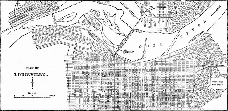 LOUISVILLE, the sixteenth city of the United States in population, and the most important place in the State of Kentucky, is situated on the south bank of the Ohio river, in 38° 3' N. lat. and 85° 30' W. long. The river is here interrupted by a series of rapids which, except at high water, oblige the steamboat traffic to make use of the Louisville and Portland Canal (2½ miles long, constructed in 1833). The city, which has an area of 13 square miles, and a water front of 8 miles, occupies an almost level site about 70 feet above low-water mark. Its plan is regular and spacious, and, in the residential portions the houses, for the most part, have lawns and gardens in front. Among the public buildings of importance may be mentioned the city-hall, the court-house, the public library, the female high school, the industrial exhibition building, the Roman Catholic cathedral, and the State school for the blind.
