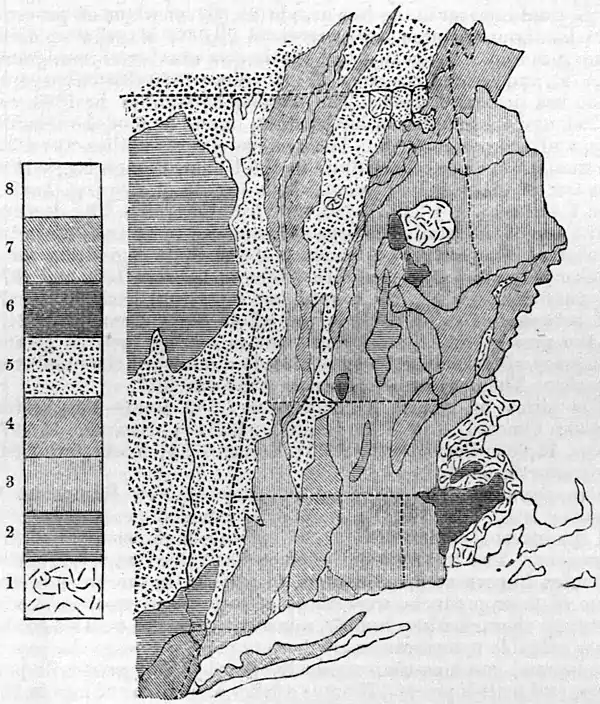 Distribution of the rocks over a large part of New England on a scale of about 100 miles to the inch. For convenience they are grouped thus:—(1) granite; (2) Laurentian of New York, and porphyritic gneiss of New England; (3) the later gneisses—Bethlehem, Lake, and Montalban; (4) Huronian, &c.; (5) Cambrian and Silurian; (6) Carboniferous; (7) Triassic; (8) Quaternary. |