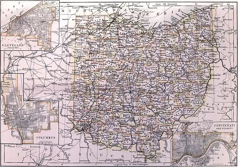Plate XXII. OHIO, the third of the States of the American Union in point of wealth and population, is situated between 38° 27′ and 41° 57′ N. lat. and between 80° 34′ and 84° 49′ W. long., and is bounded on the N. by Michigan and Lake Erie, on the E. by Pennsylvania, on the E. and S. by the Ohio river, which separates it from the States of West Virginia and Kentucky, and on the W. by Indiana. The greatest length from north to south is about 210 miles, the greatest breadth from east to west about 225 miles and the area 40,760 square miles.