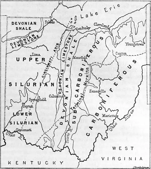 The Cincinnati axis, a low fold which traverses the State from south-west to north-east, constitutes its most influential geological feature. It entered Ohio from Kentucky at the close of Lower Silurian time, and gradually extended itself to the northward, until it had converted the western half of the State into dry land It has left a clear record of its successive stages in the strata which compose it. It did not advance steadily and equally, and the occasional relapses which it experienced have given rise to cases of overlap. It has a low, flat summit, and, on account of the soluble and easily-eroded materials of which it consists, it has suffered more from denuding agencies than the Upper Silurian strata that enclose