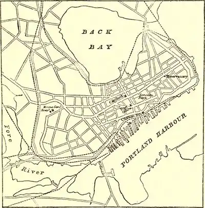PORTLAND, a city and port of entry of the United States, capital of Cumberland county, Maine, lies on Casco Bay, in 43° 39' N. lat. and 70° 13' W. long. By rail it is 108 miles north-north-east of Boston and 297 south east of Montreal. The peninsula on which it is mainly built runs out for about 3 miles, has a breadth of about ¾ mile, and rises in the west to 175 feet in Bramhall's Hill and in the east to 161 in Munjoy's Hill, which is crowned by an observatory. As seen from the harbour, the whole city has a pleasant and picturesque appearance, and the streets are in many parts so umbrageous with trees that Portland has obtained the sobriquet of the “Forest City.” A large number of the houses are built of brick. Congress street, the principal thoroughfare, runs along the whole ridge of the peninsula, from the western promenade, which looks down over the suburbs from Bramhall's Hill to the eastern promenade, which commands the bay; it passes Lincoln Park (2½ acres) and the eastern cemetery, which contains the graves of Commodore Preble and Captains Burroughs and Blythe, of Revolutionary fame. On Bramhall's Hill is the reservoir (12,000,000 gallons) of the water company, which was established in 1867 to supply the city from Lake Sebago, whose beautiful expanse (14 miles long by 11 wide) was the favourite haunt of Nathaniel Hawthorne s boyhood. The more conspicuous buildings of Portland are the city hall (1859), with a front in olive-coloured freestone, 150 feet long; the post-office (1872), constructed of Vermont white marble in the mediæval Italian style; the custom-house (1872), in granite, with rich marble ornamentation in the interior; the marine hospital (1855), a large brick erection; the Maine general hospital, 1868; the Roman Catholic cathedral; the Roman Catholic episcopal palace; and several fine churches. The Portland Society of Natural History, established in 1843 and incorporated in 1850, though it has twice lost its property by fire (1854 and 1866), has again acquired very valuable collections. The Portland institute and public library, dating from 1867, had 30,000 volumes in 1884. A medical school was founded in 1858. Portland is in the main a commercial city, with an extensive transit trade, drawing largely from Canada and the Far West. Connected with Boston by rail in 1842, and with Montreal in 1853, it has now become a terminus of six different railroads; and, since the gauge of the Grand Trunk Rail road was altered, it can import direct from San Francisco. As the harbour (which lies along the south side of the city) is seldom closed by ice, it has been long used as the winter port for the great ocean steamers between Great Britain (Liverpool and Glasgow) and Canada, which in summer ascend the St Lawrence to Montreal and Quebec. At low water vessels drawing 22 feet and at high water vessels drawing 30 feet can come up to the wharves with safety in any season; and there is secure anchorage within a mile of the shore. The dry dock is one of the deepest in the United States. The following figures show the extent of the foreign trade:—