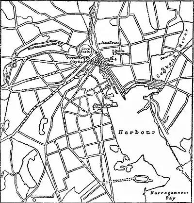 - ↑ The merchandise imported into the district of Providence was valued at $537,800 in 1884, and the imports at $25,296; 59 vessels (10,864 tons) entered from foreign ports, and 41 (5012 tons) cleared.