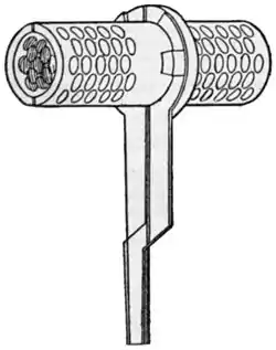 SCREW. The screw is the simplest instrument for converting a uniform motion of rotation into a uniform motion of translation (see Mechanics, vol. xv. p. 754). Metal screws requiring no special accuracy are generally cut by taps and dies. A tap is a cylindrical piece of steel having a screw on its exterior with sharp cutting edges; by forcing this with a revolving motion into a hole of the proper size, a screw is cut on its interior forming what is known as a nut or female screw. The die is a nut with sharp cutting edges used to screw upon the outside of round pieces of metal and thus produce male screws. More accurate screws are cut in a lathe by causing the carriage carrying the tool to move uniformly forward, thus a continuous spiral line is cut on the uniformly revolving cylinder fixed between the lathe centres. The cutting tool may be an ordinary form of lathe tool or a revolving saw-like disk. (See Machine Tools, vol. xv. p. 153.)