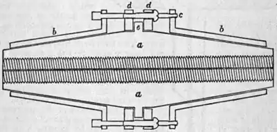 The grinding nut, about 11 inches long, has now to be made. Fig. 1 represents a section of the nut, which is made of brass, or better of Bessemer steel. It consists of four segments,—a, a, which can be drawn about the screw by two collars, b, b, and the screw c. Wedges between the segments prevent too great pressure on the screw. The final clamping is effected by the rings and screws, d, d, which enclose the flanges, e, of the segments. The screw is now placed in a lathe and surrounded by water whose temperature can be kept constant to 1° C., and the nut placed on it. In order that the weight of the nut may not make the ends too small, it must either be counterbalanced by weights hung from a rope passing over pulleys in the ceiling, or the screw must be vertical during the whole process. Emery and oil seem to be the only available grinding materials, though a softer silica powder might be used towards the end of the operation to clean off the emery and prevent future wear. Now grind the screw in the nut, making the nut pass backwards and forwards over the screw, its whole range being nearly 20 inches at first. Turn the nut end for end every ten minutes and continue for two weeks, finally making the range of the nut only about 10 inches, using finer washed emery and moving the lathe slower to avoid heating. Finish with a fine silica powder or rouge. During the process, if the thread becomes too blunt, recut the nut by a short tap so as not to change the pitch at any point. This must of course not be done less than five days before the finish. Now cut to the proper length; centre again in the lathe under a microscope; and turn the bearings. A screw so ground has less errors than from any other system of mounting. The periodic error especially will be too small to be discovered, though the mountings and graduation and centering of the head will introduce it; it must therefore finally be corrected.