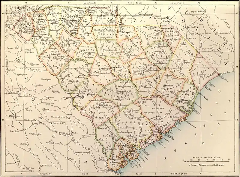 Plate V. SOUTH CAROLINA, one of the original thirteen States of the American Union, commonly known as the Palmetto State, from the abundance of this kind of 'palm on the coast, once formed a part of that vast territory of the New World claimed by the Spaniards under the name of Florida and by the French under that of New France; or, to be more concise, it comprised the southern or lower portion of what was formerly styled Carolina, and subsequently divided into North and South Carolina. It lies between 32° 4' 30" and 35° 12' N. lat. and between 78° 25' and 83° 49' W. long. In shape it is an irregular triangle, the vertex resting upon the Blue Ridge Mountains in the extreme north-west, while the Atlantic forms its base. It is bounded N. and N.E. by North Carolina, S.E. by the Atlantic, and S.W. by the Savannah river, which, with its tributaries the Tugaloo and Chatauga, separates it from Georgia. The state is 189 miles long and 160 broad, containing 30,961 square miles or 19,815,040 acres, and is divided into thirty-four counties (formerly districts). At the census of 1880 the population numbered 995,577, of whom 391,105 were white, the rest Surface. coloured. Very few Indians are to be found. The surface may be about equally divided into high, middling, and low land, the last-named rising from the sea-coast, where it is very flat and level, and gradually increasing in elevation towards the interior, where it attains a mean of 250 feet, continuing to the north line, where, after varying from 300 to 800 feet it reaches its highest elevation of 1000 feet. The land along and near the coast is low, marshy, and swampy, especially on the rivers' banks, rolling and diversified towards the centre, and undulating near the mountain slope, but in places abrupt, King's Mountain rising almost perpendicularly 500 feet. The chief elevations in this section are the Saluda Mountains, spurs of the Blue Ridge, King's Mountain (1692 feet), Paris Mountain (2054 feet), Table Rock (3000 feet), Cæsar's Head (3118 feet), and Mount Pinnacle (3436 feet). This region abounds in beautiful and picturesque scenery, rendering it attractive to tourists, and making it a great summer resort.