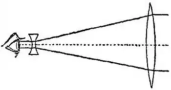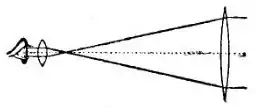 - ↑ In the case of short-sighted persons the image for very distant objects (that is, for parallel rays) is formed in front of the retina; therefore, to enable such persons to see distinctly, the rays emerging from the eye-piece must be slightly divergent; that is, they must enter the eye as if they proceeded from a comparatively near object. For normal eyes the natural adaptation is not to focus for quite parallel rays, but on objects at a moderate distance, and practically, therefore, most persons do adjust the focus of a telescope, for most distinct and easy vision, so that the rays emerge from the eye-piece very slightly divergent. Abnormally short-sighted persons require to push in the eye-lens nearer to the object-glass, and long-sighted persons to withdraw it from the adjustment employed by those of normal sight. It is usual, however, in computations of the magnifying power of telescopes, for the rays emerging from the eye-piece when adjusted for distinct vision to be parallel.