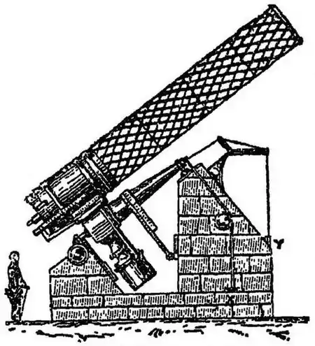 Kepler.Kepler first explained the theory and some of the practical advantages of a telescope constructed of two convex lenses in his Catoptrics (1611). The first person who actually constructed a telescope of this form was Father Scheiner, who gives a description of it in his Rosa Ursina Gascoigne.(1630). William Gascoigne was the first who practically appreciated the chief advantages of the form of telescope suggested by Kepler, viz., the visibility of the image of a distant object simultaneously with that of a small material object placed in the common focus of the two lenses. This led to his invention of the micrometer and his application of telescopic sights to astronomical instruments of precision (see Micrometer, vol. xvi. p. 242). But it was not till about the middle of the 17th century that Kepler's telescope came into general use, and then, not so much because of the advantages pointed out by Gascoigne, but because its field of view was much larger than in the Galilean telescope. The first powerful telescopes of this Huygens.construction were made by Huygens, after much labour, in which he was assisted by his brother. With one of these, of 12-feet focal length, he discovered the brightest of Saturn's satellites (Titan) in 1655, and in 1659 he published his Systema Saturnium, in which was given for the first time a true explanation of Saturn's ring, founded on observations made with the same instrument. The sharpness of image in Kepler's telescope is very inferior to that of the Galilean instrument, so that when a high magnifying power is required Cassini.it becomes essential to increase the focal length. Cassini discovered Saturn's fifth satellite (Rhea) in 1672 with a telescope of 35 feet, and the third and fourth satellites in 1684 with telescopes made by Campani of 100 and 136 feet focal length. Huygens states that he and his brother made object-glasses of 170 and 210 feet focal length, and he presented one of 123 feet to the Royal Society of London. Auzout and others are said to have made telescopes of from 300 to 600 feet focus, but it does not appear that they were ever able to use them in practical observations. Bradley, on 27th December 1722, actually measured the diameter of Venus with a telescope whose object-glass had a focal length of 21214 feet. In these very long telescopes no tube was employed, and they were consequently Aerial telescopes.termed aerial telescopes, Huygens contrived some ingenious arrangements for directing such telescopes towards any object visible in the heavens,—the focal adjustment and centring of the eye-piece being preserved by a braced rod connecting the object-glass and eye-piece. Other contrivances for the same purpose are described by La Hire (Mém. de l'Acad., 1715) and by Hartsoeker {Miscel. Berol., vol. i. p. 261). Telescopes of such great length were naturally difficult to use, and must have taxed to the utmost the skill and patience of the observers. One cannot but pay a passing tribute of admiration to the men who, with such troublesome tools, achieved such results.
