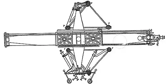 Type D.The first important instruments of type D were Mr Lassell's reflectors, the largest which, and the last, is represented in fig. 29. Lassell's mounting.The polar axis is sufficiently rigid, but the long and comparatively slender forks which carry the pivots of the central cradle are elements of instability, especially when the instrument is directed to an object of considerable hour angle. There is practical confession of this instability in the cross-bracing which connects the two forks, and which must be removed if the telescope is pointed to an object between the zenith and the elevated pole.