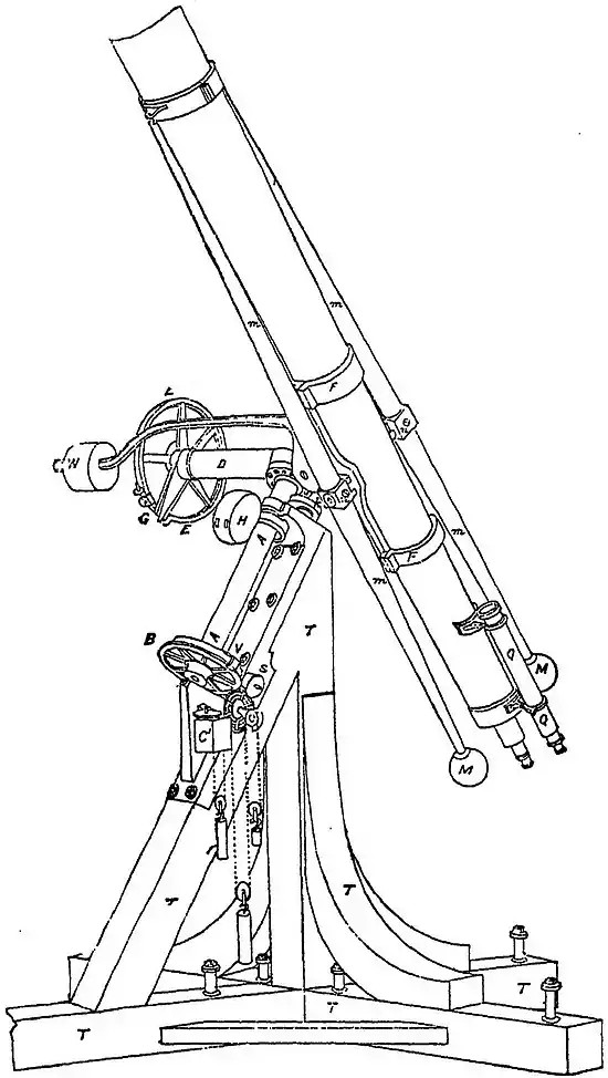 The counterpoise W balances the tube about the polar axis. M, M are counterpoise weights which act on levers m,m, whose fulcra are universal joints at n attached to the cradle. These weights serve to counterpoise the longer end of the tube and to check its flexure. QQ is the finder, a small telescope whose axis is parallel to the great telescope; having a low magnifying power and a large field of view, it serves to direct the large telescope to any object seen in the sky, which otherwise would be difficult to find in the comparatively limited field of the large telescope. The stand TTT is of oak. The instrument is described in detail by Struve (Beschreibung des auf der Sternwarte zu Dorpat befindlichen grossen Refractors von Fraunhofer, Dorpat, 1825, fol.). The instrument was an enormous advance upon all previous telescopes for micrometric research. In the hands of Struve results were obtained by it which in combined quality and quantity had never before been reached in micrometric research. Its success was such that the type of Fraunhofer's telescope became stereotyped for many years not only by his successors but throughout Germany. When twelve years afterwards Struve ordered the 15-inch refractor for the new observatory at Pulkowa, the only important change made by Fraunhofer's successors was, at Struve's suggestion, the substitution of a stone pier for the wooden stand in the original instrument.