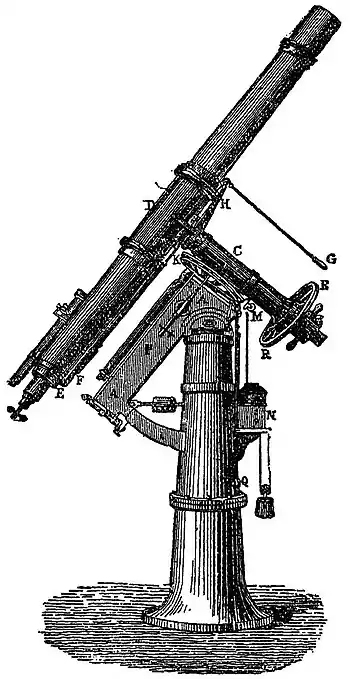 A strong cast-iron pillar is substituted for Fraunhofer's stand. On the semi-cylindrical top of the pillar rests the cast-iron box AA, which contains at its upper and lower extremities the bearings of the polar axis. Its mode of connexion with the pillar permits the inclination of the box to be changed for adjustment of the inclination of the polar axis. The strong cross-head C, supporting the bearings of the declination axis, is of cast iron, bolted to a flange on the upper pivot of polar axis. Fraunhofer's cradle and wooden tube are abolished, and in their place is a cast-iron cylindrical tube D, flanged at both ends and also at the point where it is bolted to a corresponding flange on the end of the decimation axis, all three flanges being cast in one piece with the central tube ; the rest of the tube consists of two slightly tapered brass cylinders bolted by strong flanges to the central tube D. The handle F clamps the arm H to the cross-head C at pleasure, and slow motion in declination is communicated by the handles at E and G. Two circles at K and M are attached to the upper part of the polar axis. To one of these motion is communicated by the tangent screw at M (turned by the clock N) acting on teeth cut at the edge of the circle. The other is a graduated hour circle read by two opposite microscopes, one of which is seen at P. The endless cord hanging down and holding a sliding ring at Q is employed to give slow motion in right ascension, in some instruments by moving the frame of the driving screw in the direction of the axis of the screw, in others by moving differential wheels which accelerate or retard the velocity of rotation of the driving screw without affecting the rate of the clock. The decimation circle RR, is attached to the farther end of the declination axis and is inconvenient of access. Cooke's stand is admirable for its symmetry and simplicity of design, its just apportioning of strength, and a general rigidity with suitability of means to ends.