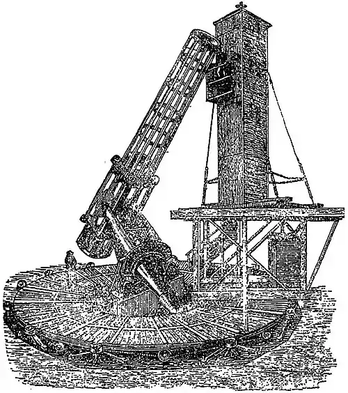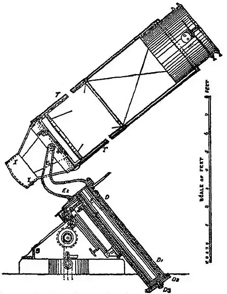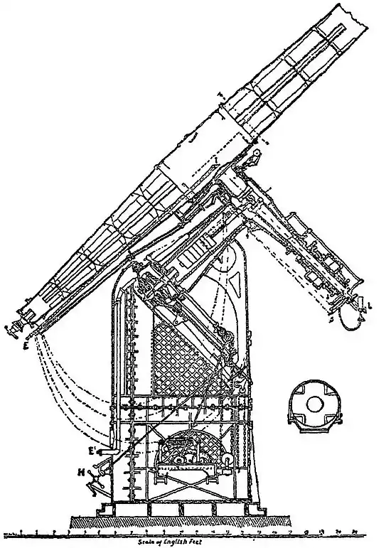 Rosse's 3-foot mounting.There is also an admirable mounting of type D designed by Lord Rosse for his 3-foot reflector at Birr Castle, described by him in Phil. Trans., vol. clxxi. p. 153. The instrument is planned on the broad lines of Lassell's telescope (fig. 29), but the badly planned and weak fork of the latter is replaced by a thoroughly rigid bent fork made of boiler plate a quarter of an inch thick, firmly riveted to angle iron of 214 x 214 x 516inch scantling along each angle, the whole, as we have proved by trial, being exceedingly rigid. It would be an improvement to adopt Mr Common's plan of putting the declination axis a little out of the line of prolongation of the polar axis, and thus dispense with the counter-weight; and we should prefer hollow steel tubes with push and pull bracing rather than the angle iron rods and bracing which form the tube.