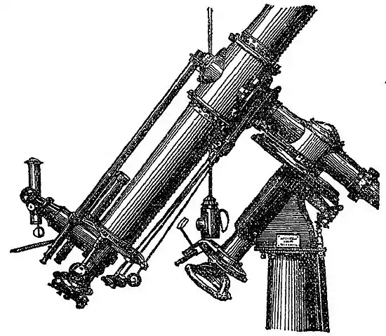Oxford heliometer.About 1840 a great advance was made in the right direction by the Repsolds of Hamburg in the equatorial mounting of the Oxford heliometer. The driving circle was greatly increased in diameter, and placed at the upper end of the polar axis, and both the polar axis and the declination axis were made much stronger in proportion to the mass of the instrument they were destined to carry. (A figure of this instrument is given in the Oxford Observations for 1850.) Cooke's equatorial.About 1850 Thomas Cooke of York began his career as a maker of equatorial telescopes, and gave a new character to the German mounting. Fig. 21 represents a typical equatorial of his design.