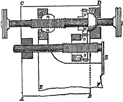 The nut (n) is in the form of a ball working in a socket on the extremity of the clamp-arm EFG. A short stiff spring (S) is attached to this clamp-arm, bearing, not directly against any part of other arm, but against end of a second screw of same pitch as the main screw, the nut of which (oo) is toothed on edge, and works into a wheel of equal size (pp) on main screw. The point of this second screw, therefore, advances as much in one direction as the frame ABCD is carried in other, according as the milled head is turned; and consequently the point of the screw does not sensibly vary in its position with respect to the clamp-arm EFG. A short stiff spring can therefore be used, and the disadvantage above mentioned disappears."