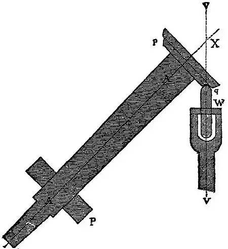 If now a wheel W is forced up against q with a pressure equal to the weight of the moving part of the instrument, the whole weight of the moving part would rest upon W in unstable equilibrium; or if a pressure R, less than W, is employed, we have the end friction on the lower bearing removed to an extent and the friction on the bearings of the upper pivot removed to the extent of —where is the latitude of the place. The wheel W is therefore mounted on a guided rod, which is forced upwards by suitable levers and weights, and this relief of pressure is precisely proportional to the pressure on the respective bearings. The Repsolds find it unnecessary to relieve the friction of the declination axis.