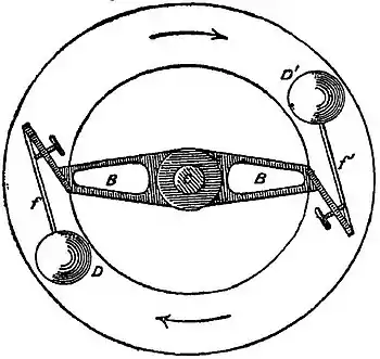 E is the axis of rotation; C and D are fans that are pulled towards the spindle E by chronometer springs in the boxes A and B. The fans fly out symmetrically when the velocity exceeds 25 or 30 revolutions per second; the increased resistance of the air thus produced checks the velocity of rotation. By means of the small weights W, W attached to arms on the fans Hilger states that it is possible to adjust this governor so that it shall even lose by an increase of the driving weight.