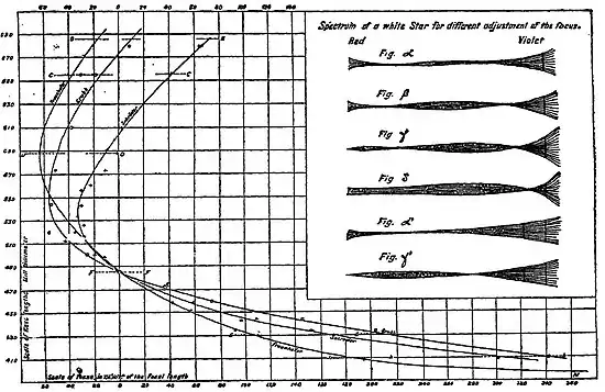 - ↑ For recent literature on the secondary spectrum in double and triple object-glasses, &c., see W. Schmidt, Die Brechung des Lichtes in Gläsern, insbesondere d. achromat. und aplanat. Objectivlinse, Leipsic, 1874; W. Harkness, "On the Colour Correction of Achromatic Telescopes," in Amer. Jour. of Science and Arts, September 1879, pp. 189–196; C. S. Hastings, "Triple Objectives with Complete Colour Correction," ib., December 1879, pp. 429–435; Perty, Ueber die Grenzen der sichtbaren Schöpfung nach den jetzigen Leistungen der Mikroskope und Fernröhre, Berlin, 1874; H. C. Vogel, Ueber eine einfache Methode zur Bestimmung der Brennpunkte und der Abweichungskreise eines Fernrohr-Objectivs für Strahlen von verschiedener Brechbarkeit; C. A. Young, "The Colour-Correction of Certain Achromatic Object-Glasses," in Amer. Jour. Sci., June 1880, pp. 454–456; also a review of these papers by A. Safarik, Vierteljahrdhrschrift der astronomischen Gesellschaft, 1882, pp. 13-39.