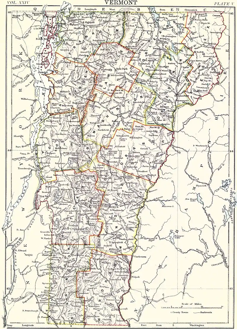 Plate V. VERMONT, one of the New England States of the American Union, lies between 42° 44' and 45° 0' 43" N. lat. and 71° 38' and 73° 25' W. long. It is bounded on the N. by the Canadian province of Quebec, on the E. by New Hampshire, from which it is separated by the Connecticut river, on the S. by Massachusetts, and on the W. by New York, from which it is separated for more than 100 miles by Lake Champlain. The Canadian boundary is 90 miles long; but from this the width of Vermont continually grows less towards the southern border, where it is 41 miles. The length is 158 miles. The boundary between Vermont and New York passes through the western side of Lake Champlain, so that three-fourths of the lake and most of its islands belong to the former. The area of the State is 10,212 square miles.