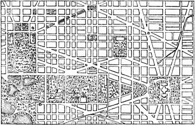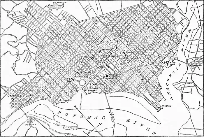 Washington was selected as the site for the federal capital in 1790. The States of Maryland and Virginia had ceded to the general Government a tract of land 10 miles square, lying on both sides of the Potomac, for that purpose. The Virginia portion was subsequently re-ceded to that State. In 1790 Georgetown was a city of considerable importance, but upon the site of Washington there were very few settlers. The plan of the city was drawn by Major l'Enfant, and the city laid out in accordance therewith by Andrew Ellicott. At that time the greater part of the site lying west of the Capitol was a morass, well-nigh impassable. The machinery of the government was moved to Washington in 1800, when it was “a backwoods settlement in the wilderness.” It existed principally upon paper, and the magnificence of the plan only served to emphasize the poverty of the execution. In 1814, during the second war with Great Britain, it was captured by the British troops, and the Capitol, together with most of the other public buildings, was burned. In 1839 it was described as a “large straggling village reared in a drained swamp.” Indeed, in 1871, although it had attained to considerable size, it was exceedingly backward in all municipal improvements. The public buildings and grounds were neglected. The streets were deep in mud, or clouded with dust; the unbuilt portions were morasses; and the sewerage was worse than useless. In that year Congress abolished the charters of the two cities, and instituted a form of territorial government, with a governor and a legislative assembly. The matter of municipal improvement was placed in the hands of a board of public works, with authority to carry out a comprehensive scheme. The work was commenced and pushed forward with the greatest energy, and almost fabulous results were achieved. In a very few years the appearance of the city was revolutionized. The cost of these improvements, was, however, enormous, and it was increased greatly by the rapidity with which the work was done. Much of it, too, was badly executed, so that it has been necessary to replace it. But, in spite of these drawbacks, the fact that Washington is one of the most beautiful and comfortable cities in the world is principally due to the first governor of the District and his board of public works. This government lived too fast to live long. In 1874 Congress abolished the territorial form, and established the present government by three commissioners.