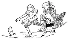 Johnny-cake came up close, and leaning towards the fox screamed out: I've outrun an old man, and an old woman, and a little boy, and two well-diggers, and two ditch-diggers, and a bear, and a wolf, and i can outrun you too-o-o!"