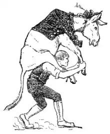 On the next Monday, Lazy Jack went once more, and hired himself to a cattle-keeper, who gave him a donkey for his trouble. Jack found it hard to hoist the donkey on his shoulders, but at last he did it, and began walking slowly home with his prize. Now it happened that in the course of his journey there lived a rich man with his only daughter, a beautiful girl, but deaf and dumb. Now she had never laughed in her life, and the doctors said she would never speak till somebody made her laugh. This young lady happened to be looking out of the window when Jack was passing with the donkey on his shoulders, with the legs sticking up in the air, and the sight was so comical and strange that she burst out into a great fit of laughter, and immediately recovered her speech and hearing. Her father was overjoyed, and fulfilled his promise by marrying her to Lazy Jack, who was thus made a rich gentleman. They lived in a large house, and Jack's mother lived with them in great happiness until she died.
