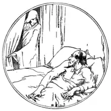 The following night he put the golden arm under his pillow, and was just falling asleep, when the ghost of his dead wife glided into the room. Stalking up to the bedside it drew the curtain, and looked at him reproachfully. Pretending not to be afraid, he spoke to the ghost, and said: "What hast thou done with thy cheeks so red?"