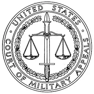 In front of a silver sword, point up, a gold and silver balance supporting a pair of silver scales, encircled by an open wreath of oak leaves, green with gold acorns; all on a grey blue background and within a dark blue band edged in gold and inscribed "UNITED STATES COURT OF MILITARY APPEALS" in gold letters;