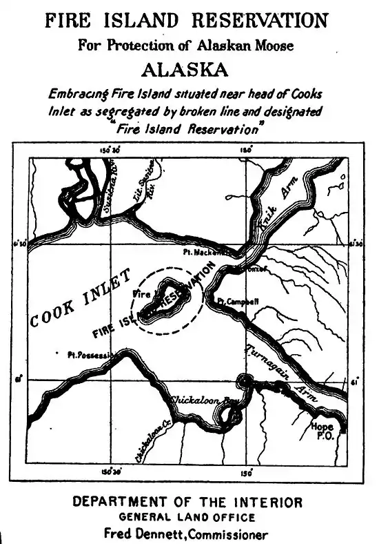 It is hereby ordered that Fire Island, located approximately in latitude sixty-one degrees, fifteen minutes North, longitude one hundred and fifty degrees, fifteen minutes West from Greenwich, and near the head of Cook Inlet, south coast of Alaska, be and the same is hereby reserved and set apart for the use of the Department of Agriculture as a preserve and breeding ground for the Alaska moose.