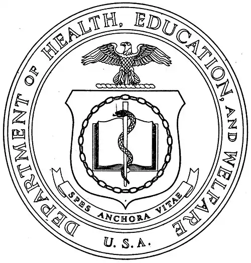 Below the shield a white scroll inscribed with the motto "SPES ANCHORA VITAE"[1] in black letters, all on a circular sanguine background within a white band, inner edge white, outer edge sanguine, and inscribed "DEPARTMENT OF HEALTH, EDUCATION, AND WELFARE U. S. A.";